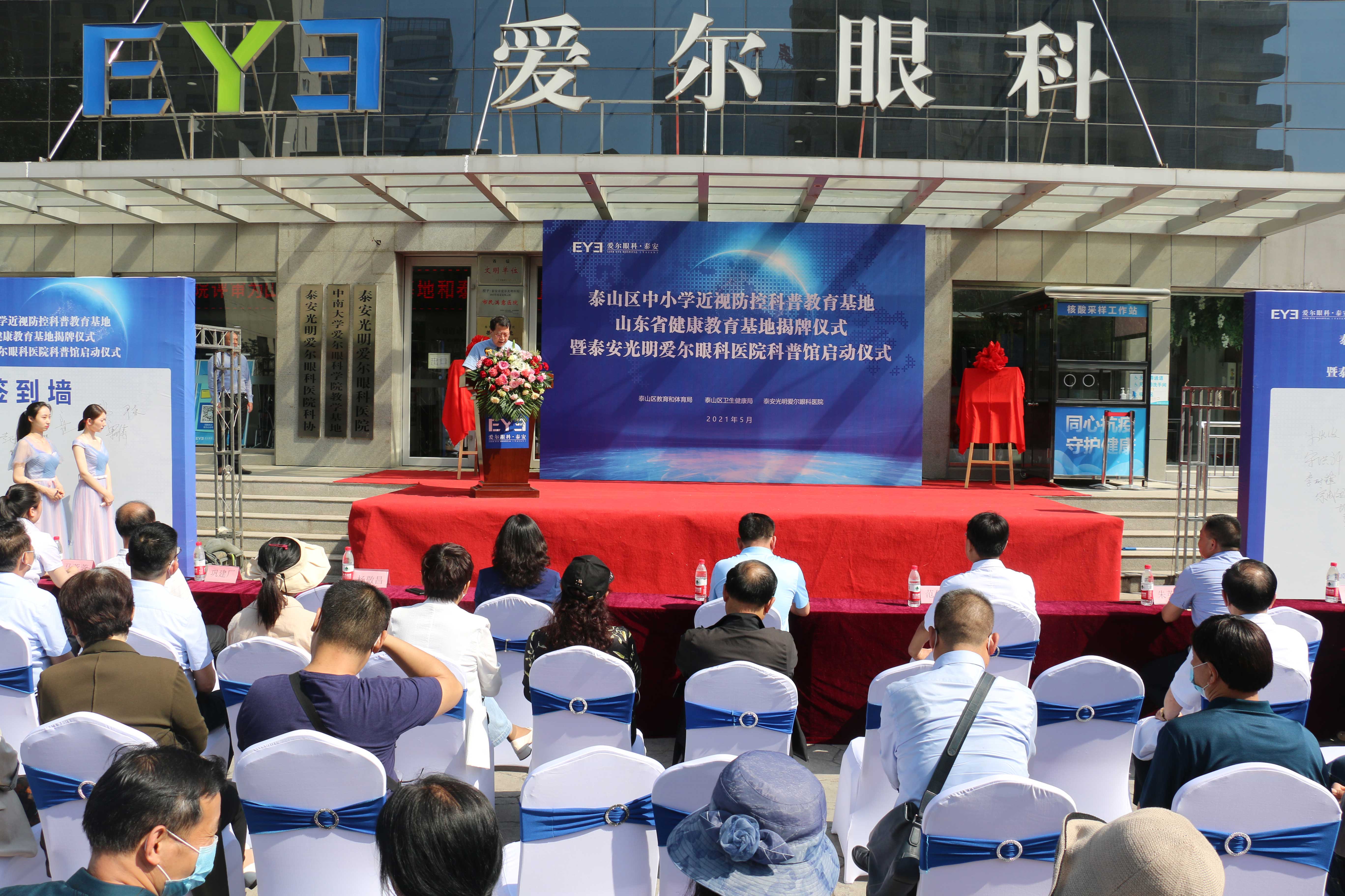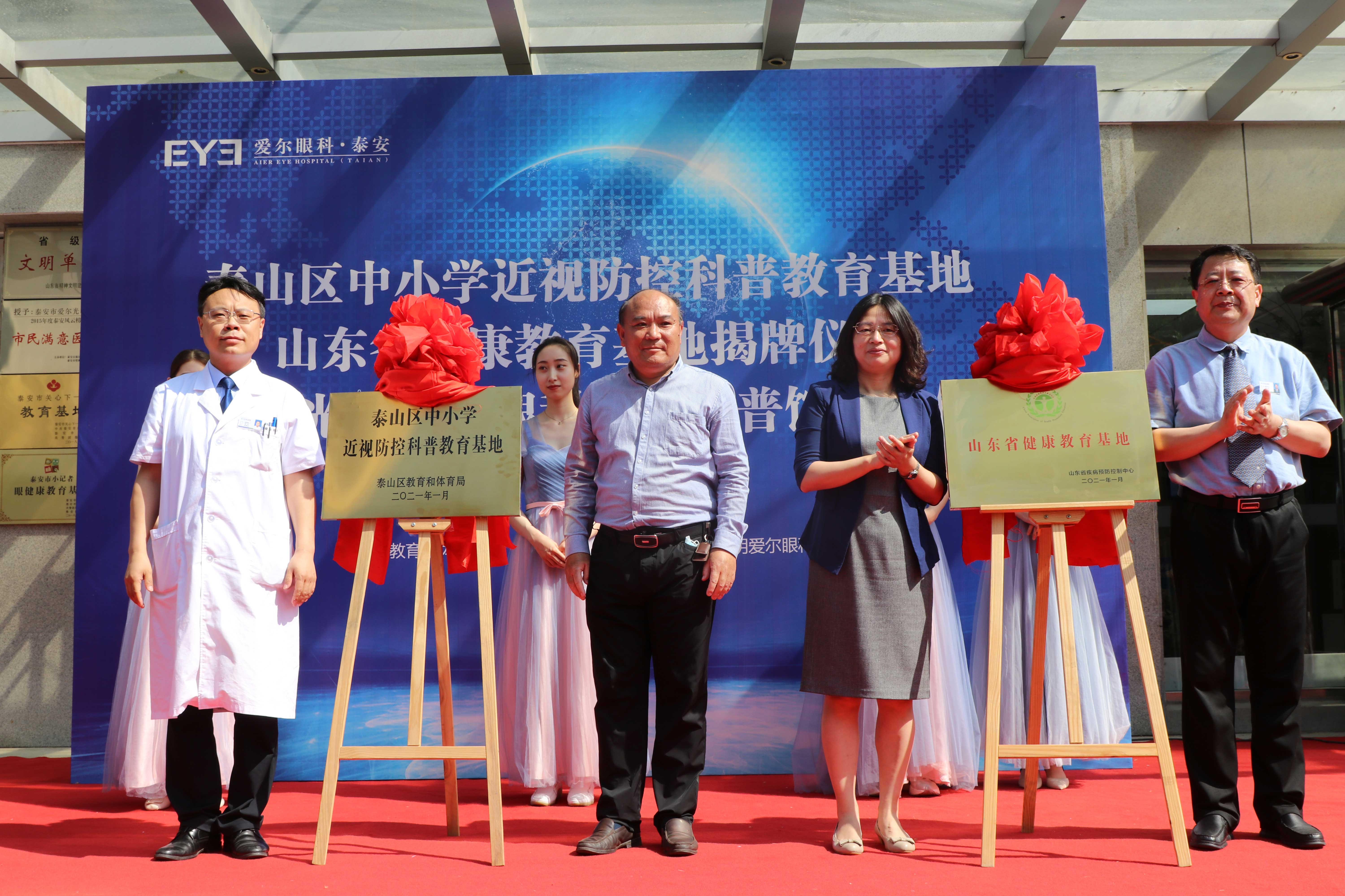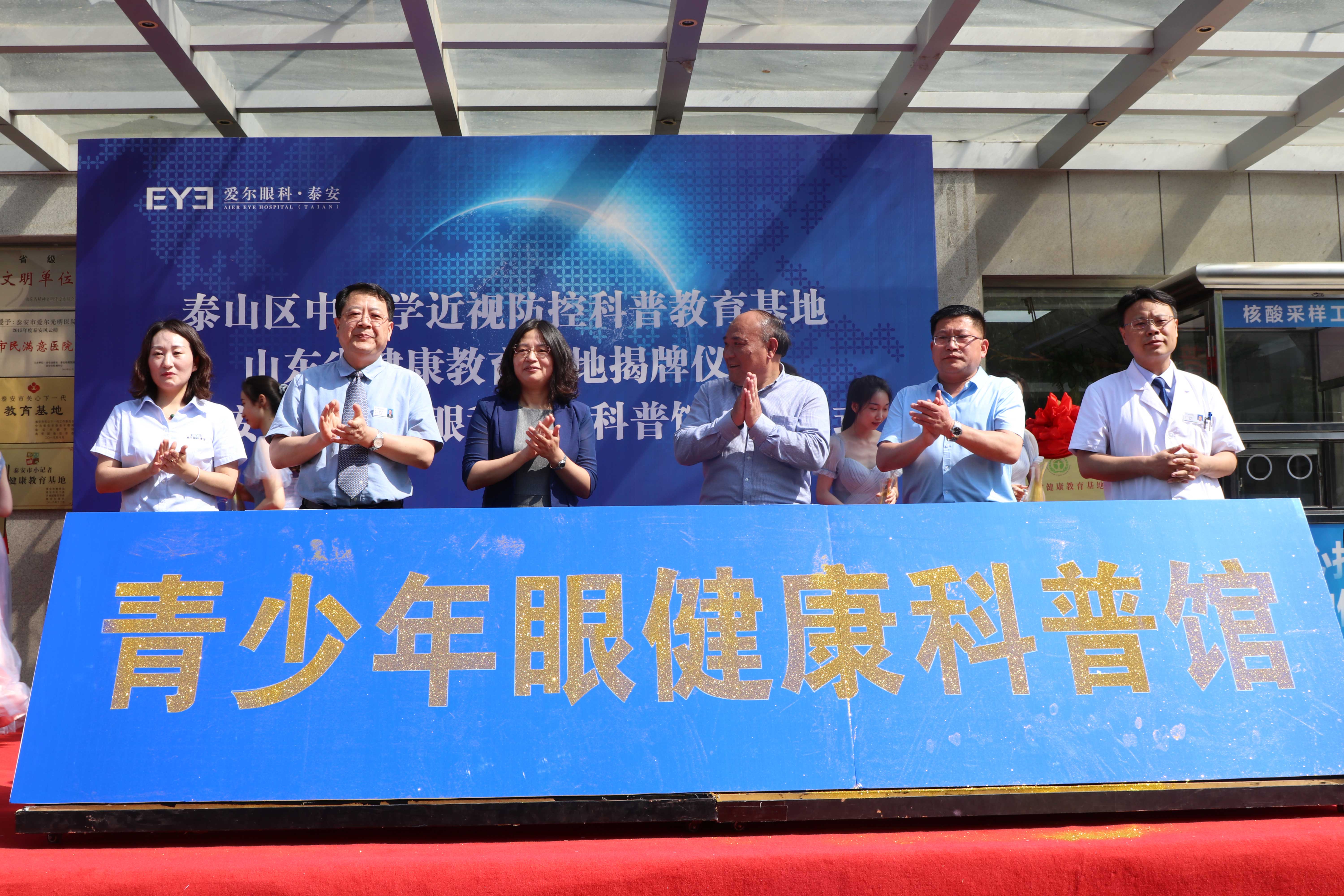 ? ? ? ?九點二十分,“山東省健康教育基地”和“泰山區(qū)中小學(xué)近視防控科普教育基地”正式揭牌。隨后,泰山區(qū)衛(wèi)生健康局黨組成員、副局長寧方莉、泰山區(qū)教育和體育局副局長高京杰、泰山區(qū)疾病預(yù)防控制中心副主任梁洪濤、泰安光明愛爾眼科醫(yī)院CEO楊敬昌、院長范傳峰、社會公益部主任王海燕登臺,宣布泰安市眼健康科普館正式啟動,并向市民免費開放。